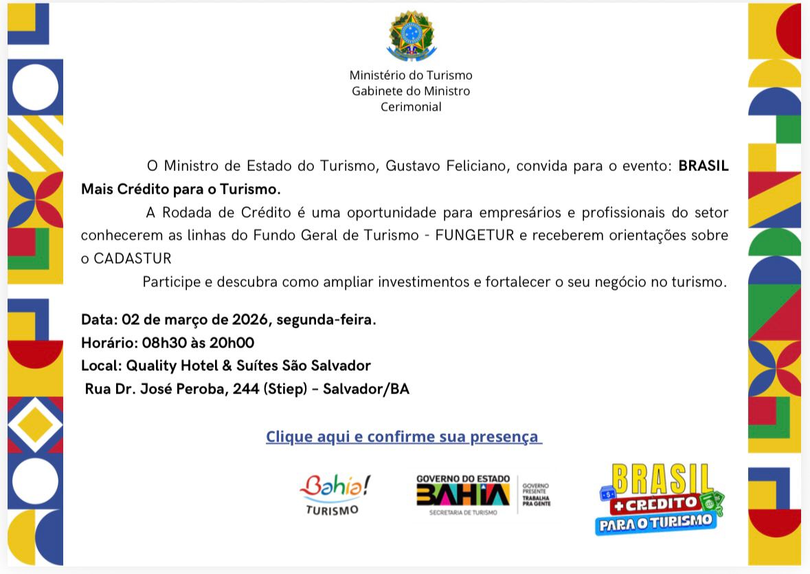A Secretaria de Turismo do Estado da Bahia – SETUR, em parceria com o Ministério do Turismo, realizará em Salvador o Lançamento do Projeto “Brasil Turismo com Crédito – Jornada Nacional de