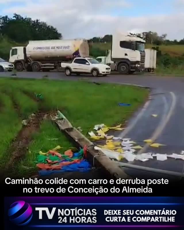 Caminhão colide com carro e derruba poste no trevo de Conceição do Almeida
