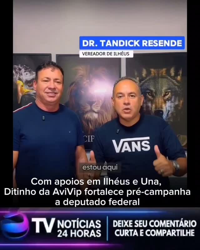 Com apoios em Ilh\u00e9us e Una, Ditinho da AviVip fortalece pr\u00e9-campanha a deputado federal \n\n_Articula\u00e7\u00e3o pol\u00edtica amplia base de aliados e consolida crescimento do projeto no interior da Bahia._ \n\nO pr\u00e9-candidato a deputado federal, Ditinho da AviVip segue ampliando sua base pol\u00edtica no estado e recebeu novos apoios em Ilh\u00e9us e Una. As articula\u00e7\u00f5es fortalecem sua pr\u00e9-campanha e ampliam a presen\u00e7a pol\u00edtica do pr\u00e9-candidato na regi\u00e3o sul da Bahia. \n\nDurante agenda recente, Ditinho recebeu o apoio do vereador Tandick Resende e da lideran\u00e7a Marcello Almeida, comerciante do munic\u00edpio de Una e esposo da ex-candidata a prefeita do munic\u00edpio, Dra. Joanira Leite. \n\nCom uma trajet\u00f3ria marcada pela atua\u00e7\u00e3o empresarial e social, Ditinho tem ampliado sua rede de apoiadores em diversos munic\u00edpios baianos. Antes mesmo do in\u00edcio oficial da campanha, o pr\u00e9-candidato j\u00e1 desenvolvia a\u00e7\u00f5es voltadas para melhorias nas comunidades, al\u00e9m de manter contato direto com moradores para compreender as demandas locais. O reconhecimento ao seu trabalho tamb\u00e9m est\u00e1 ligado \u00e0 atua\u00e7\u00e3o como impulsionador do com\u00e9rcio, gerador de empregos e incentivador da cultura em diferentes regi\u00f5es do estado. \n\nA agenda pol\u00edtica do pr\u00e9-candidato tamb\u00e9m tem alcan\u00e7ado outros estados do pa\u00eds. Ditinho participa de reuni\u00f5es e encontros onde amplia o di\u00e1logo com diferentes lideran\u00e7as, fortalecendo a constru\u00e7\u00e3o de alian\u00e7as e o reconhecimento de suas propostas. \n\nAo comentar a amplia\u00e7\u00e3o da rede de apoios e as articula\u00e7\u00f5es pol\u00edticas que v\u00eam sendo constru\u00eddas durante suas agendas pelo estado, Ditinho destacou a import\u00e2ncia da uni\u00e3o de lideran\u00e7as que acreditam em um projeto coletivo. _\u201cSeguimos somando for\u00e7as com pessoas que acreditam no di\u00e1logo, no trabalho e em um futuro melhor para todos\u201d_ , afirmou.\n#ditinhoavivip#tvnoticias24horas”,”delight_ranges”:[],”image_ranges”:[],”inline_style_ranges”:[],”aggregated_ranges”:[],”ranges”:[{“entity”:{“__typename”:”Hashtag”,”__isEntity”:”Hashtag”,”url”:”https:\/\/www.facebook.com\/hashtag\/ditinhoavivip?__eep__=6″,”mobileUrl”:”https:\/\/m.facebook.com\/hashtag\/ditinhoavivip”,”__isNode”:”Hashtag”,”id”:”9204400896291258