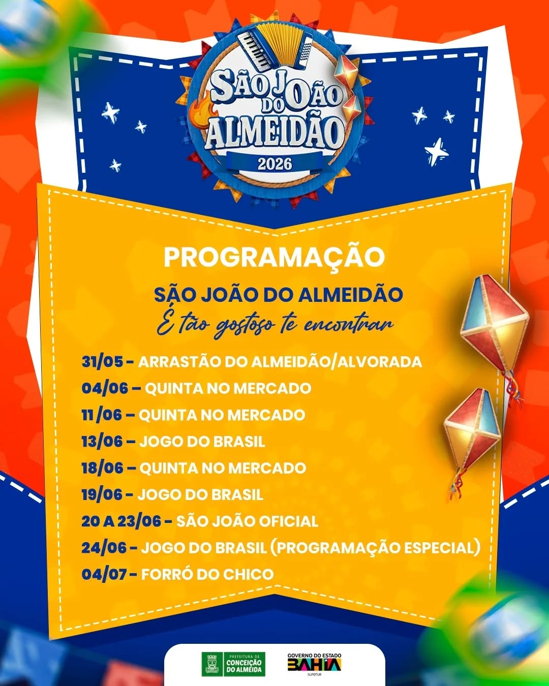 Com o tema “É tão gostoso te encontrar”, o São João do Almeidão 2026 promete unir tradição e alegria em uma programação pensada para todas as idades, consolidando Conceição do Almeida como um dos destinos juninos mais procurados da Bahia.