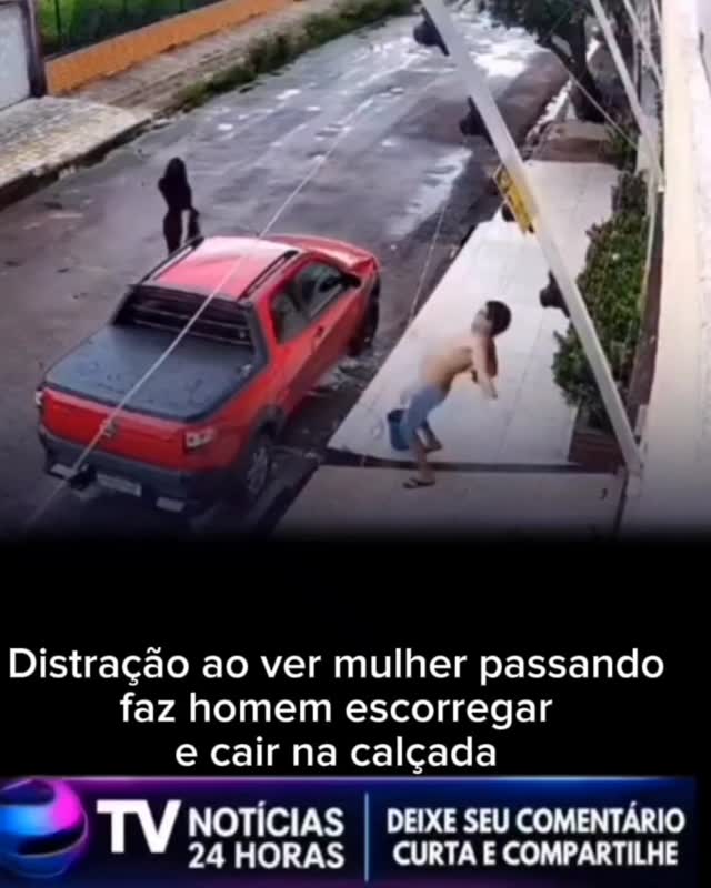 Um vídeo que vem circulando nas redes sociais chamou a atenção dos internautas ao registrar uma cena inusitada e, ao mesmo tempo, preocupante. Nas imagens, um homem aparece lavando o próprio carro quando se distrai ao observar uma mulher que passava pela rua. Em seguida, ele perde o equilíbrio e escorrega na calçada molhada, caindo de forma repentina.