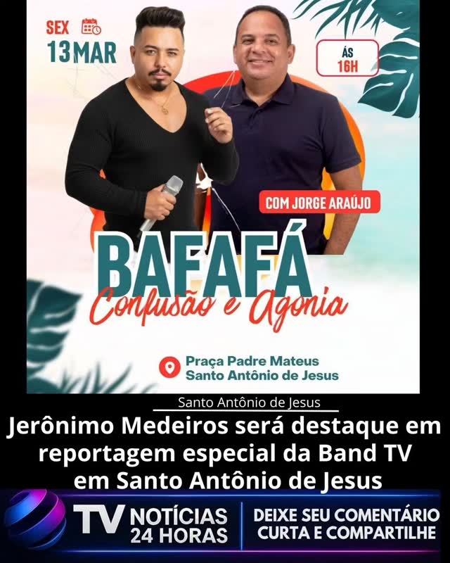 Santo Antônio de Jesus será palco de uma reportagem especial da Band TV nesta sexta-feira (13), quando a equipe do programa Bafafá realizará uma gravação dedicada à trajetória do cantor santoantoniense Jerônimo Medeiros, artista reconhecido no cenário musical e que vem colecionando fãs em diversas regiões do Brasil.