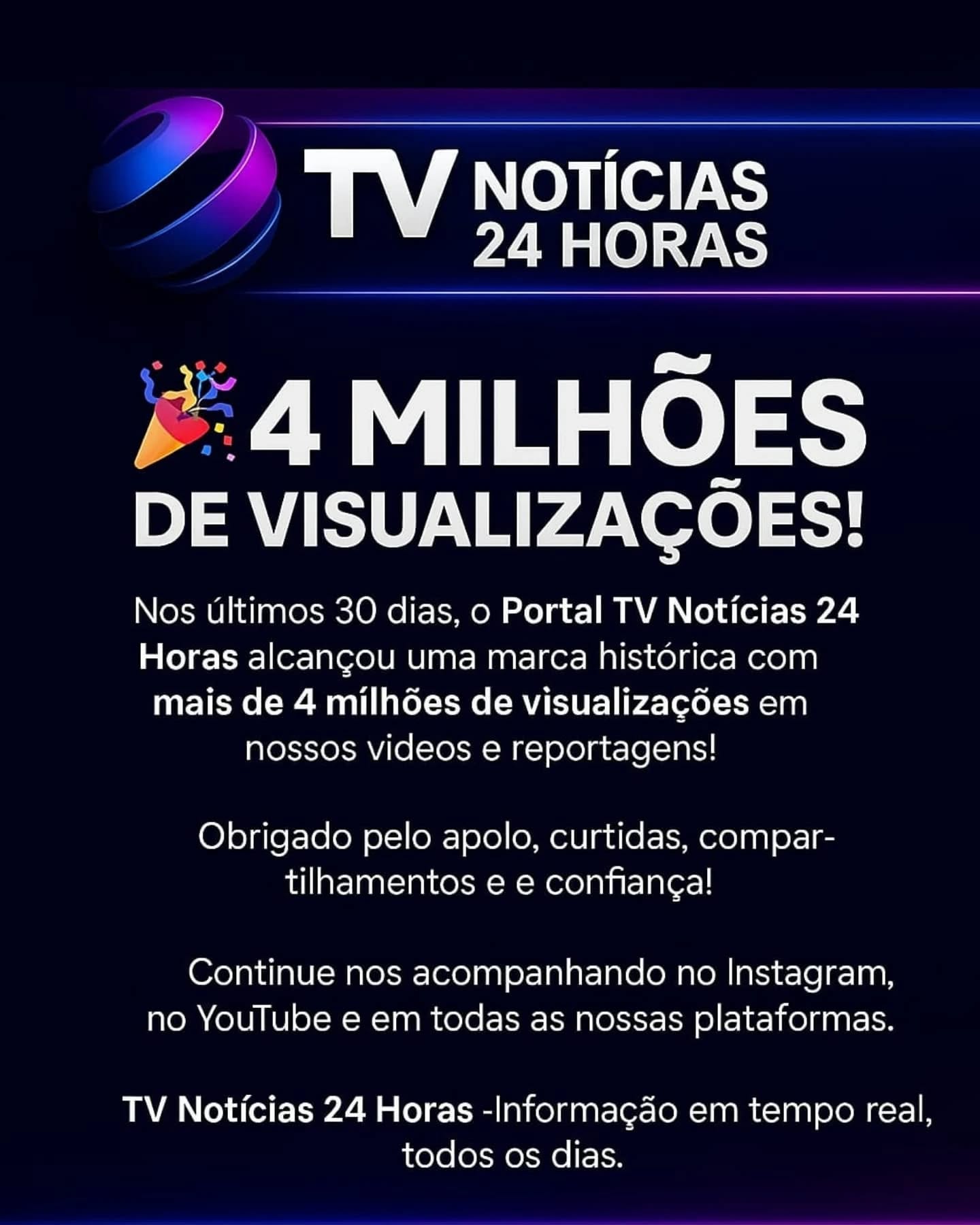 Portal TV Notícias 24 Horas atinge 4 milhões de visualizações em 30 dias e celebra crescimento nas plataformas digitais.